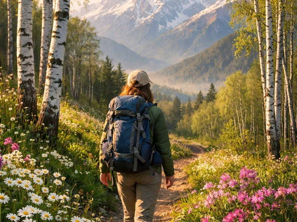 Du packst deinen Rucksack und begibst dich auf eine inspirierende Wanderung durch einen Birkenwald an einem warmen Frühlingstag. Umgeben von sanft rauschenden Blättern verlässt du dich ganz auf deinen inneren Kompass, der dich sicher leitet.
