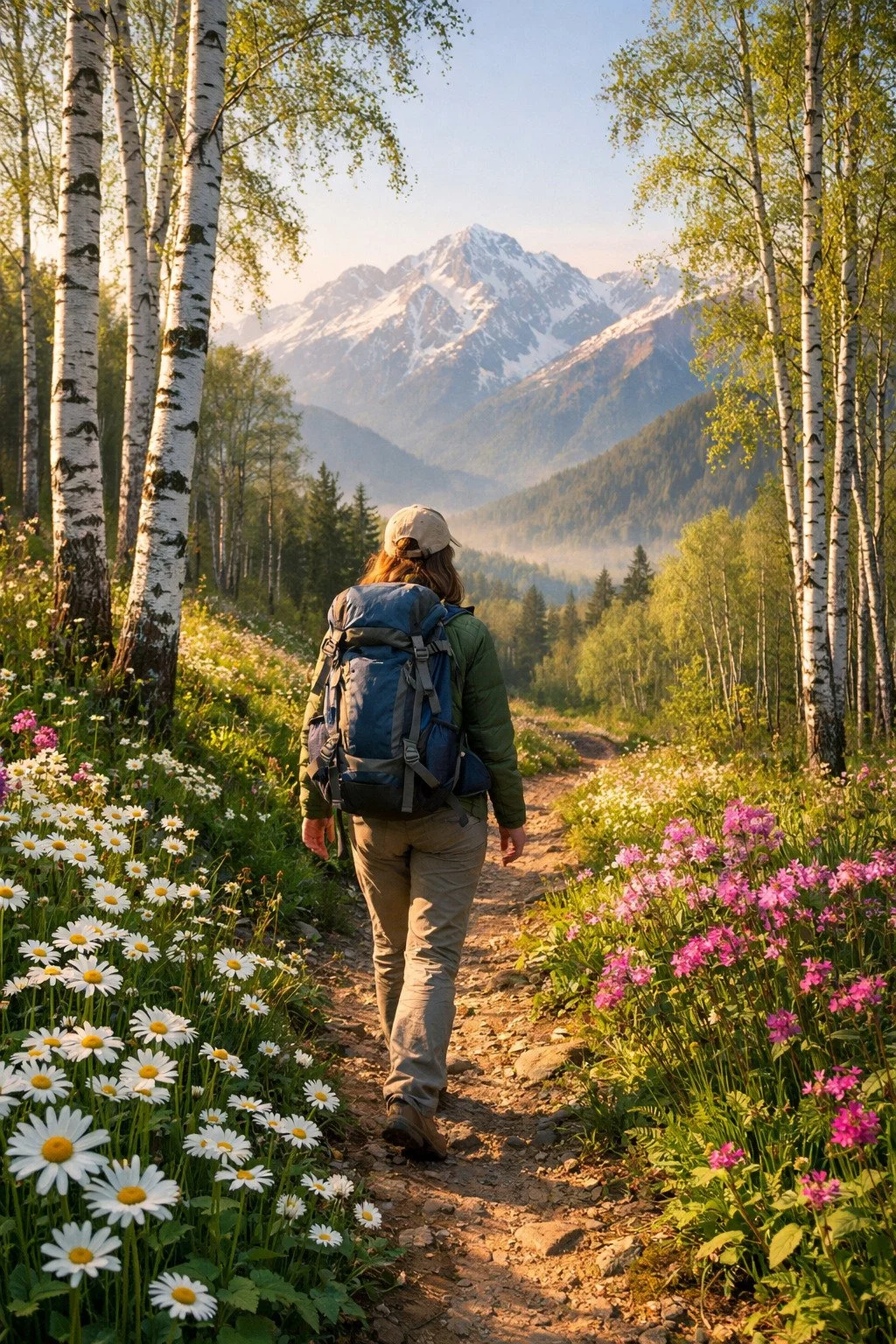 Du packst deinen Rucksack und begibst dich auf eine inspirierende Wanderung durch einen Birkenwald an einem warmen Frühlingstag. Umgeben von sanft rauschenden Blättern verlässt du dich ganz auf deinen inneren Kompass, der dich sicher leitet.